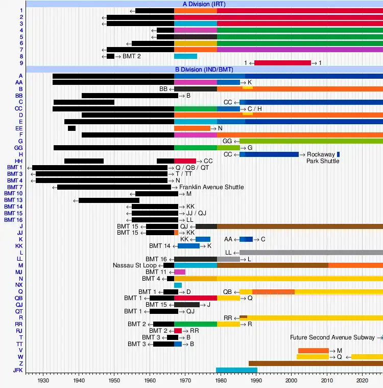 B Division (IND/BMT)A Division (IRT)JFK (New York City Subway service)Z (New York City Subway service)W (New York City Subway service)V (New York City Subway service)TT (New York City Subway service)T (New York City Subway service)RJ (New York City Subway service)RR (New York City Subway service)R (New York City Subway service)QT (New York City Subway service)QJ (New York City Subway service)QB (New York City Subway service)Q (New York City Subway service)NX (New York City Subway service)N (New York City Subway service)MJ (New York City Subway service)M (New York City Subway service)LL (New York City Subway service)L (New York City Subway service)KK (New York City Subway service)K (New York City Subway service)JJ (New York City Subway service)J (New York City Subway service)16 (Brooklyn–Manhattan Transit Corporation service)15 (Brooklyn–Manhattan Transit Corporation service)14 (Brooklyn–Manhattan Transit Corporation service)13 (Brooklyn–Manhattan Transit Corporation service)10 (Brooklyn–Manhattan Transit Corporation service)7 (Brooklyn–Manhattan Transit Corporation service)4 (Brooklyn–Manhattan Transit Corporation service)3 (Brooklyn–Manhattan Transit Corporation service)1 (Brooklyn–Manhattan Transit Corporation service)HH (New York City Subway service)H (New York City Subway service)GG (New York City Subway service)G (New York City Subway service)F (New York City Subway service)EE (New York City Subway service)E (New York City Subway service)D (New York City Subway service)CC (New York City Subway service)C (New York City Subway service)BB (New York City Subway service)B (New York City Subway service)AA (New York City Subway service)A (New York City Subway service)9 (New York City Subway service)8 (New York City Subway service)7 (New York City Subway service)6 (New York City Subway service)5 (New York City Subway service)4 (New York City Subway service)3 (New York City Subway service)2 (New York City Subway service)1 (New York City Subway service)