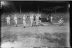 It is said that after one particularly satisfying victory over the Philadelphia Phillies, Mutrie (who was also the team's manager) stormed into the dressing room and exclaimed, "My big fellows! My giants!"[6] From then on (1885), the club was known as the Giants. However, more recent research has suggested that the New York World was already widely using the Giants nickname throughout the 1885 season, before the legendary game was played.[7]