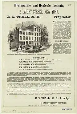 At the same address on Laight Street, Trall also operated The Hygienic Institute.[2] In the 1860s E. P. Miller was its proprietor and resident physician, whilst Trall remained consulting physician. Its female physician was Ellen Goodell Smith.[11] In 1864, it was reported that the institute had treated more than 10,000 patients.[11]