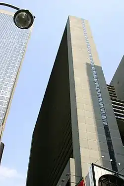 The hotel received mixed reviews, with architectural critics and theatrical personalities being particularly negative toward the project.[26][90] The hotel also required approval for two special permits to increase the floor area ratio.[26][45] New York City Planning Commission chairman John Eugene Zuccotti scheduled a hearing for these permits in mid-1973.[86] The Portman Hotel was experiencing delays by the end of 1973 because of a lack of funding.[83] The New York City fiscal crisis had also endangered public funding for the convention center,[91] and, by January 1975, Portman warned that he would withdraw from the Portman Hotel unless the convention center was funded.[92][93] Construction costs had decreased enough that the hotel only needed $100 million, but only about $38 million had been raised.[92][94] That December, Portman announced he would cancel the plans for the Portman Hotel.[95][96][97] Though the designs were completed and the city government had given approvals, investors had not shown interest in the project.[96][97] The cancellation meant that, for the time being, the Morosco and Helen Hayes theaters could continue to operate.[95] The Bankers Trust Company owned the site of the theaters.[98][99]
