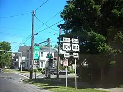 Midway between Fulton and the Minetto hamlet of the same name, NY 48 serves Battle Island State Park, named for a small island in the Oswego River a short distance to the north. NY 48 presses onward along the edge of the Oswego to the hamlet of Minetto, where it intersects CR 24,[3] formerly NY 48A.[4] North of the hamlet, NY 48 passes by the Oswego Country Club as it enters the Oswego city limits. Once in the City of Oswego, NY 48 becomes West First Street. At Utica Street, NY 48 briefly turns west before turning back north at West Fifth Street and terminating at NY 104 (Bridge Street). West First Street continues north for an additional six blocks to the Lake Ontario shoreline.[3] NY 48 is city-maintained within the cities of Fulton and Oswego; the rest of the highway is maintained by the New York State Department of Transportation (NYSDOT).[5][6]