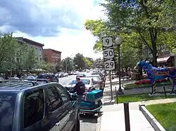 Now in the center of Saratoga Springs, US 9 and NY 50 become concurrent, proceeding north into the core of downtown as Broadway past Congress Park and a junction with the northern terminus of NY 9P (Spring Street). A block north of the junction, US 9 and NY 50 junction with NY 29 (Washington Street). US 9, NY 29 and NY 50 now are concurrent through the center of Saratoga Springs, reaching a junction with the southern terminus of NY 9N (Church Street), where NY 29 also turns east onto Lake Avenue. US 9 and NY 50 continue north through downtown, reaching the junction with Van Dam Street, where the routes turn northeast onto the C.V. Whitney Memorial Highway, a four-lane boulevard through Saratoga Springs. At the junction with Marion Avenue, US 9 continues north on Marion while NY 50 continues east on the Whitney.[5]