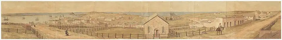 Under Captain James Wallis, commandant from 1815 to 1818, the convicts' conditions improved, and a building boom began. Captain Wallis laid out the streets of the town, built the first church of the site of the present Christ Church Cathedral, erected the old gaol on the seashore, and began work on the breakwater which now joins Nobbys Head to the mainland. The quality of these first buildings was poor, and only the (much reinforced) breakwater survives. During this period, in 1816, the first school was built in Newcastle.[17]