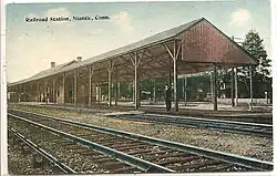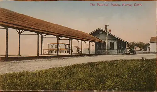 The original station burned on September 23, 1898. It was replaced in early 1899 by a saltbox style station similar to others that the New Haven built that decade.[5] The station was heavily used by soldiers traveling to Camp Niantic for maneuvers, as well as by spectators.[5] The station was little-used by mid-century; it was divided into retail stores in 1954, and a 15-foot (4.6 m) by 30-foot (9.1 m) wooden shelter was constructed nearby.[5] The 1899-built station building was destroyed by fire on August 22, 1970, and demolished in early September.[5]