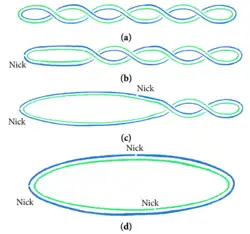 The diagram shows the effects of nicks on intersecting DNA in a twisted plasmid. Nicking can be used to dissipate the energy held up by intersecting states. The nicks allow the DNA to take on a circular shape.[2]