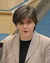 Sturgeon served as Shadow Minister for Health and Community Care from 2000 to 2003, and Shadow Minister for Justice from 2003 to 2004. She also served as a member of the Education, Culture and Sport Committee and the Health and Community Care Committee.[32]