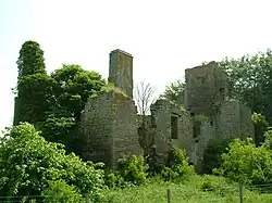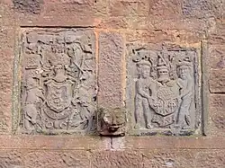 Alexander Elphinstone (later 5th Lord Elphinstone) obtained a remission from James VI for the crime of attending the Mass at Andrew Napier's house.[47] Barbara Gray, the widow of James Wood, remained at Birness, occasionally hearing Mass.[48] After continued feuding, the youngest son of Patrick and Nicholas, Harry Wood, became the laird of Bonnytoun. In July 1624, he was kidnapped at St Vigeans Kirk and carried to his house at Letham by George Gordon of Gight, who made him sign over a large sum of money.[49] The remains of Bonnyton Castle collapsed in 1785 and there is little to see at the site, except earthworks, the ruined dovecote, and two salvaged carved stone armorial panels set in the wall of a nearby barn.[50][51]
