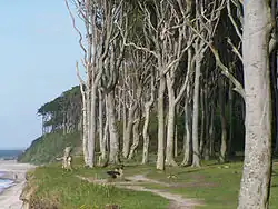 The municipality lies on the Baltic Sea coast between the oldest German seaside spa of Heiligendamm and Warnemünde. Large parts of the municipal territory are forested. West of the village lies Nienhagen Wood (Nienhäger Holz) immediately behind the high sea cliffs which roughly measure roughly 12 m (39 ft). This mixed forest is circa 180 hectares (1.8 km2) in area and is called Ghost Wood (Gespensterwald) by the locals. The origin of this description is not exactly known, but is probably derived from its coastal strip of the wood, which 1,250 m (4,100 ft) long and around 100 m (330 ft) wide, and is mainly stocked with beech and a few oaks. The beech trees, in particular, have been shaped by the sea winds, grow mainly on one side and have twisted, snake-like branches, which gives them a ghostly appearance especially at twilight and in the mist.