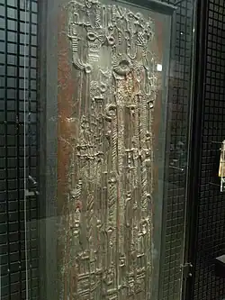 The museum has displayed works of art by Nigerian artists such as Nike Davies-Okundaye, Abiodun Olaku, Djakow Kassi, Bruce Onobrakpeya, Bolaji Ogunwo, Yusuf Durodola, Chinze Ojobo,[32] Nosa Iyobhabha, Duke Asidere,[33] Ben Enwonwu, Nathaniel Hodonu,[34] Northcote W. Thomas, Kelani Abass[35] and Elizabeth Ekpetorson.[36] In 2012, the museum presented an exhibition featuring artwork by artist Ndidi Dike.[37][38][39][40] In November 2019, the museum organized an exhibition with art pieces by German-Nigerian artist Ngozi Schommers.[41][42][43] The museum contains ancient crowns, Royal regalias, artifacts belonging to the Kingdom of Benin, cultural objects belonging to the Ibibio people, Igbo-Ukwu bronze artifacts, stone monoliths of the Oron culture[44] and terracottas belonging to the Nok culture.[45][46][47] The museum also contains photographs of the different presidents of the states of Nigeria.[48] In the textile section, there is a collection of batik fabrics.[49] The museum also has Ere figurines.,[24] photographs on the colonization of Nigeria[35] and exhibits related to the culture of Ifẹ, an ancient Yoruba city.[29]
