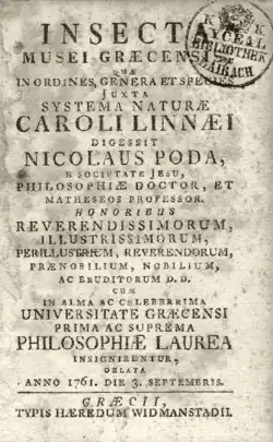 Nikolaus Poda von Neuhaus (October 4, 1723 – April 29, 1798) is best known for his work in the field of entomology in the middle to late 1700s.