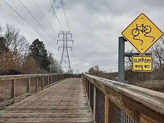 It crosses behind two local schools, including the Edina High School and passes over another boardwalk before making its way to a newly constructed roundabout at Tracy Avenue and turns south. On the longest boardwalk of the trail, it passes just east of Heights Park,[3] and parallels the Xcel Energy powerlines and the Canadian Pacific Railway.[4]