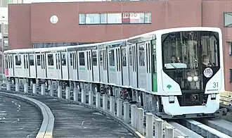 From its opening, the line has used a fleet of 300 series trainsets with stainless steel bodies.[5] From 10 October 2015, one new 330 series trainset was introduced on the line.[5] This five-car set was built by Mitsubishi Heavy Industries, and has an aluminium body.[5] A new 320 series trainset (set 21) entered service on the line on 10 May 2017.[6] Like the 330 series, this set has two pairs of sliding doors on the side of each car, and all seating is longitudinal bench seating.[6]