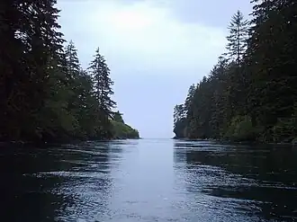Nitinat Lake drains into the Pacific Ocean just north of the Pacific entrance to the Strait of Juan de Fuca via the Nitinat Narrows, a narrow tidal passage about 3 km (1.9 mi) long. Tidal bores (ocean waves travelling up the lake) occur on the narrows, the heights of which depend on tide heights, and these can be dangerous. The small First Nations village of Whyac lies on the southern lakeshore beside Nitinat Narrows and just north of the First Nations village of Clo-oose, also on the coast.
