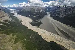 The stream heads in Nizina Glacier, flows southward about 16 miles (26 km) to a point near the mouth of Dan Creek, where it takes an easterly course, which it follows for about 16 miles (26 km) to its junction with the Chitina. It drains an area of 1,240 square miles (3,200 km2) and is nearly as large as the Chitina at their junction. For the first 20 miles (32 km) of its course, it flows over a gravel flood plain from 0.5–2 miles (0.80–3.22 km) wide, bordered by steep-sloped mountains 6,000–8,000 feet (1,800–2,400 m) in height. At low water, it follows one or more constantly shifting channels. At medium stage, the number of channels increases, and finally at flood height, the entire flood plain becomes covered from bank to bank with swift-flowing, muddy water carrying large quantities of sand and gravel. Below Young Creek the bordering mountains are separated by a wider valley in which the river has cut a deep trench through the gravel and shale formations. Finally, for the last 2–3 miles (3.2–4.8 km) of its course, the river flows between walls of solid rock, forming a box canyon for much of the distance. The river has an average grade of about 30 feet (9.1 m) per mile.[1]