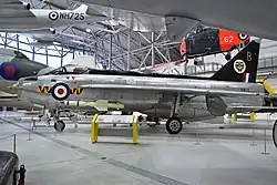 Upon arrival back to England, No. 74 (F) Squadron converted to their first jet aircraft; the Gloster Meteor F.3, being based at RAF Colerne, Wiltshire. The squadron soon moved to RAF Bentwaters, before finally settling at RAF Horsham St Faith, Norfolk in August 1946. While here, as one of the first adopters of the Meteor F.3, the squadron formed the first all jet fighter wing with No. 616 Squadron and No. 504 Squadron.[8] 'The Tigers' had a brief stay at RAF Lübeck between July and August 1947. From December 1947, onward, the squadron began to re-equip with Meteor F.4s, completing conversion by March 1948. In October 1950, the squadron received the much improved Meteor F.8. From 1954 onward, the squadron's Meteors began to be camouflaged in dark green and dark sea grey, this coincidentally marked the return of 'tiger stripe' markings on the squadron's aircraft; something not seen since the Gloster Gauntlets.[17] After 12 years of flying Meteors, No. 74 (F) Squadron converted to the Hawker Hunter F.4 in March 1957. The Hunter F.4s wouldn't be operated for long, as the squadron started to re-equip with Hunter F.6s in November 1957, with the Hunter F.4s being phased out by January 1958.