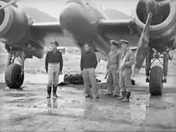 The crews of the first two No. 93 Squadron Beaufighters to arrive at Bofu, Japan after escorting P-51 Mustang fighters