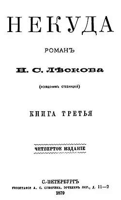 No Way Out (Russian: Не́куда, romanizedNekuda) is an anti-nihilist novel by Nikolai Leskov, published in 1864 under the pseudonym M.Stebnitsky in Biblioteka Dlya Chteniya.[1] The original epigraph ("The slow one will be God-provided, the quick one will run up himself to grab. A proverb") has been later removed. During the author’s lifetime the novel was re-issued five times: in 1865, 1867, 1879, 1887 and 1889.[2]