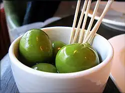 Nocellara del Belice is an olive cultivar from the Valle del Belice area of south-western Sicily. It is a dual-purpose olive, grown both for oil and for the table. It is used to make "Valle del Belìce" extra-virgin olive oil, which is pressed from a minimum of 70% Nocellara del Belice olives.[1][2] As a table olive it may be treated by various methods, one of which is named for the comune of Castelvetrano in the Valle del Belice;[3] these may be marketed as Castelvetrano olives in the United States and elsewhere,[4] and are large, green olives with a mild, buttery flavor.[4][5]