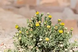 Flowers are present between August and November.[2] They may, however, be present year-round and are also common between March and May.[4] The yellow disc shaped flower heads are solitarily arranged on the ends of branches. The disc (outer) florets are sometimes purplish in the upper part.[3] The pappus (a modified calyx) is made of barbed bristles.[2] The hairy stems holding the flowers are surrounded by three to four rows of green bracts. They are sometimes tinged purple and often have yellow or orange air sacs along the midline.[3]