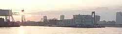 ![]() The Noordereiland in Rotterdam, with De Rotterdam in the background on the left, the Erasmus Bridge on the right, and the Maaskade in the foreground, with the Hulstkamp building on the left | |