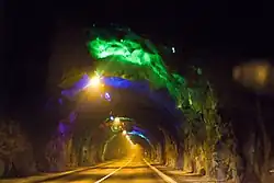 In 1988 Landsverkfrøðingurin (the national office of public works) carried out a number of seismic investigations in Leirvíksfjørður (the strait between Eysturoy and Borðoy). A year earlier, an engineer had drawn up an overall plan showing alternative sites for constructing tunnels. Further surveys in 1988 confirmed that the tunnel plans were considered to be economically viable. In 2003, after the 1990s Faroese economic crisis, work began on boring the tunnel between Eysturoy and Borðoy. The official opening of the tunnel was on April 29, 2006.[2] Traffic has steadily increased from 662,828 vehicles in 2007 to 1,308,519 in 2019 (3,585 per day).[3] The project cost 395 million Danish kroner and is expected to be repaid by 2021.