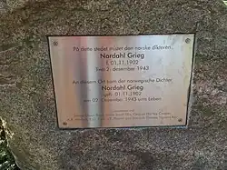 In 2003, a memorial stone was unveiled at the site (52°23′51″N 13°12′58″E / 52.39750°N 13.21611°E) where Nordahl Grieg died in Kleinmachnow.[18]