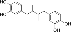 Nordihydroguaiaretic acid (NDGA) is a classic lignan, a phenylpropane dimer linked by a bond between positions C8 and C8′, as opposed to a neolignan. It is a natural compound found in the creosote bush (Larrea tridentata).