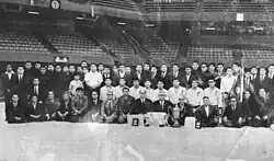 Pictured is Yoshimi Osawa (8th from the left, front row), Hideo Yamamoto (9th from the left, front row) with Nori Bunasawa (4th from the left, center row, wearing a judogi)