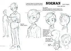 According to Kaiu Shirai, Norman is the mainstay of the group and had a "lighter" mood compare to Ray and Emma.[1][2] For his character design, Shirai asked for something like angelic, and a bit ethereal, with a simple design philosophy. Making him look like a moon or a knight of the story.[3] Posuka Demizu had difficulties creating the character design of Norman, including his body type, face and hair.[4] According to Demizu, Norman was supposed to be slender in his original design, but it was difficult to show the difference between him and the other children. All of them wear the same clothes, so she decided to maintain the current design.[3]