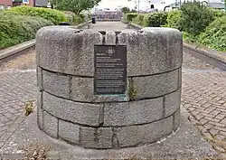 An older memorial stands in the gardens at Woodside Ferry and Bus terminal, comprising a stone plinth bearing a plaque with the George Cross citation from the London Gazette engraved on it.