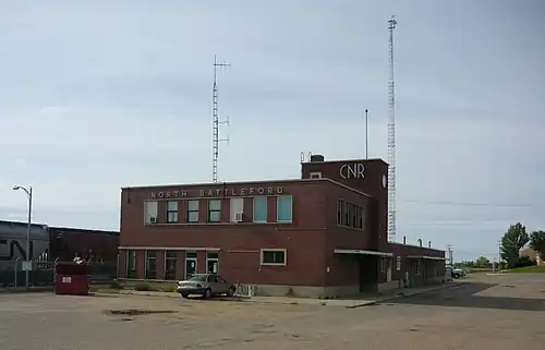 The North Battleford station is a former railway station in North Battleford, Saskatchewan. It was built by the Canadian National Railway in 1956 and used as a passenger terminal. North Battleford no longer receives scheduled passenger rail service (the closest stations are now served by Via Rail station to the south in Biggar and Unity), and the station is now used as an office space for CNR, and was once the intercity bus terminal.[1]