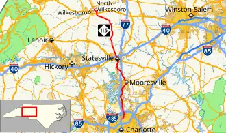 | Wilkes | North Wilkesboro | 68.0– 68.2 | 109.4– 109.8 | Exit 282 (US 421); southern end of US 421 Bus. Concurrency | |