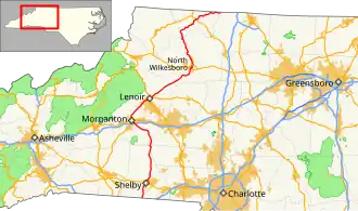 North Carolina Highway 18 (NC 18) is a primary state highway in the U.S. state of North Carolina. Traveling north–south through the Foothills region, it connects the cities of Shelby, Morganton, Lenoir, Wilkesboro and North Wilkesboro.