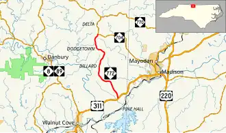 The highway starts at the intersection of US 311 and Pine Hall Road and then continues north from the intersection. At Madison Road, NC 772 bears left but shortly begins the curve toward the northeast. The road makes another westerly turn at K-Fork Road but again turns back toward the north before reaching NC 704. NC 772 ends at NC 704 south of Sandy Ridge. The road is a rural two lane road throughout the entire length of the highway.[1]