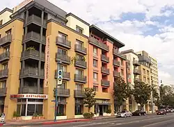 In the late 1940s and 1950s the area saw the first department-store-anchored, auto-oriented shopping center in the Valley: Valley Plaza, covering both a development at Laurel Canyon at Victory boulevards but also a loose collection of other retail stores south along Laurel Canyon to Oxnard, including a branch of the May Co., the second-largest suburban department store branch in the U.S. at the time. In the mid-1950s Valley Plaza claimed to be the largest shopping center on the West Coast of the United States and the third-largest in the country.[17] It was difficult for the Lankershim retail district to compete and by 1980, most stores had closed including Rathbun's.[18][17] The May Co. at the south end of the Valley Plaza shopping district built its own attached, enclosed mall, Laurel Plaza, opening in 1968.[19] The last department of Valley Plaza's anchors, Sears, closed in 2019[20] as department store-anchored shopping centers lost favor. As of 2020, much of the Valley Plaza retail space is either empty, portion is now a middle school, and the Laurel Plaza site is under construction to become the NoHo West mixed-use development, which includes retail.[21]