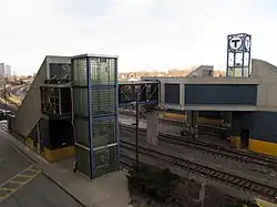 Construction of the station began in 1966, and North Quincy opened along with Wollaston and Quincy Center on September 1, 1971.[1] Shortly after the station opened, the MBTA added a west entrance at the north end to serve the adjacent State Street South office facility.[29] On September 27, 1991, the MBTA was awarded $32 million in federal funds for accessibility renovations at North Quincy, and for a new station at Riverside.[30] The work was combined with clearing a two-track railbed on the west side of the station for the restoration of Old Colony Lines commuter rail service. The northwest entrance was rebuilt to accommodate the new tracks, while the southwest entrance was removed.[31] The elevators were completed in 1998, making the station accessible.[32]