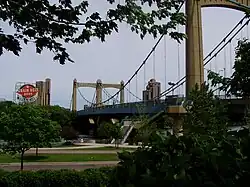 The new orientation of Northeast Minneapolis to welcome "outsiders" is perhaps best seen in the 1991 Hennepin Avenue Bridge. The new suspension bridge is styled after the first permanent bridge across the Mississippi River (at the same site), also a suspension bridge.