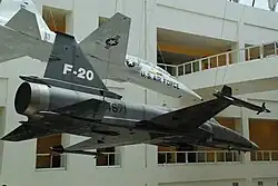 The Northrop F-20 Tigershark (initially F-5G) is a prototype light fighter, designed and built by Northrop. Its development began in 1975 as a further evolution of Northrop's F-5E Tiger II, featuring a new engine that greatly improved overall performance, and a modern avionics suite including a powerful and flexible radar. Compared with the F-5E, the F-20 was much faster, gained beyond-visual-range air-to-air capability, and had a full suite of air-to-ground modes capable of utilizing most U.S. weapons. With these improved capabilities, the F-20 became competitive with contemporary fighter designs such as the General Dynamics F-16 Fighting Falcon, but was much less expensive to purchase and operate.
