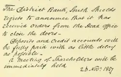 The District Bank, South Shields regrets to announce that it has received orders from the Head Office to close the doors. Deposits and credits accounts will be fully paid with as little delay as possible. A meeting of shareholders will be immediately held.