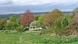 The only numbered route is the B4203 road which runs from Bromyard northward, in part becoming the parish boundary with Brockhampton and, then beyond the parish, through Tedstone Wafer village to Worcestershire. From the B4203 at Bromyard Downs runs south a minor road, arcing around the Downs to Linton, and to the A44 which runs from Bromyard to the city of Worcester at the east. A further road, Burying Lane at the south-west of the parish, runs from a junction with the B4203, 400 yards (366 m) from the parish border with Bromyard, to the Downs agglomerated residential area. At the north of the Downs, a road runs south-east from the B4203, crosses into Brockhampton to the A44 near the Bromyard Downs Caravan and Motorhome Club campsite. A further road north on the B4203 runs to Edvin Loach, with a fork which runs to the bungalow estate of Saltmarshe Castle Park in Edvin Loach. Saltmarshe Castle Park is the site of Saltmarshe Castle, which, before boundary changes, was part of Norton; the Park's main entrance is on the B4203. At 70 yards (64 m) farther north on the B4203 is the road junction with a road running east, which begins as the boundary with Brockhampton and then runs 2 miles (3 km) to Whitbourne Hall. All other routes are country lanes, bridleways, farm tracks and footpaths.[10][11][12][13]