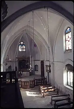 The existing building is gothic in style and consists of a square nave, with a semi-octagonal apse, cross vaults an arch covering the western part, a bell tower (built in 1860) and convent buildings to the north of the church. To the east of the nunnery buildings is the sarcophagus of Lady Dampierre, an Abbess of the nunnery. A number of tomb slabs in the floor of the church dating from the 14th and 15th centuries were noted in the nineteenth and early twentieth centuries, but these were lifted in the 1960s as a conservation measure and kept in the north porch.[5]