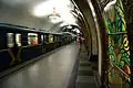 The most notable element of the station's design are 32 pieces of spectacularly illuminated stained glass.[17] The glass is integrated into the pylons in pairs and coated with steel and gilded brass. These pairs face the hall with a multi-colored glass that forms the likenesses of flowers, plants, and stars.[17] Inside the stained glass windows, in the upper part, small medallions are inserted, which depict genre scenes of an ideal peaceful life. Six of them depict people of profession: architect, geographer, artist, power engineer, musician, and agronomist. The rest depict geometric patterns and five-pointed stars. Additionally, they installed lamps behind the glass.[18]