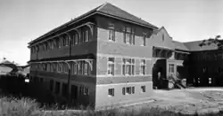 The first stage of Nundah State School's brick school building (now called Block A) was opened by the Minister for Public Instruction, Frank Cooper, on 5 October 1935 at the 70th anniversary of the school's commencement.[76] Around the same time, retaining walls to the north and west of Block A were completed, followed by walls along the corner of Bage Street to the east and Boyd Road to the north in 1940. The concrete retaining walls had metal chain wire fences above and the wall to the north of Block A had steps accessing the tennis- basketball court area below.[77][78][79][80][1]