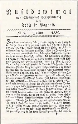 Nusidavimai apie evangelijos... was published in 1832–1834 and 1837–1914, and briefly revived in 1921 by the Evangelical Society Gluosnis in Klaipėda. In 1832 and from around 1865, it was published monthly. In other years, it appeared on average about three times a year. The circulation was about 400 to 500 copies.[5] Initially, it was distributed by members of the Missionary Society and various priests; from 1869, it was delivered via the Reichspost. From 1843, for some time, the language was edited and corrected by linguist Friedrich Kurschat.[5] It mainly published translated texts from Königsberger Missionsblatt – primarily letters from the missionaries, but also included some ethnographic or historical information about the peoples that the missionaries worked with and other religious texts. On occasion, it published original texts about local issues of Prussian Lithuanians, such as the status of the Lithuanian language, emigration to the United States, children's education.[5] In 1876, it published a map of Western Europe and Africa with labels in Lithuanian – the first map in Lithuanian.[5]