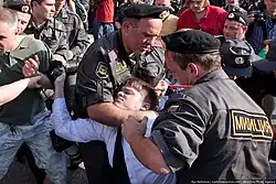 - OMON have broken up several opposition rallies, including the Dissenters' Marches since 2006, sparking reports of police brutality, including excessive use of force and arbitrary detention of participants.[21] In 2007, the brutal actions of OMON against peaceful protesters and arrests of opposition figures were harshly criticised by the European Union institutions and governments.[22] Moscow OMON also made international news when it prevented gay rights activists (including the European Parliament members) from marching after the Mayor of Moscow Yury Luzhkov did not allow a planned parade to take place in 2007.[23]