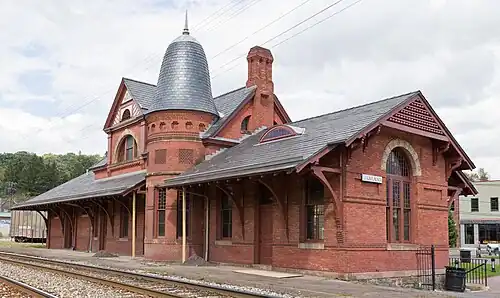 Oakland station is a historic railroad station in Oakland, Maryland. It is a large brick structure with a two-story central section featuring a cylindrical tower with a domed cap and one-story wings extending from each end along the railroad tracks. It was designed by Baldwin and Pennington, and built in 1884 by the Baltimore and Ohio Railroad (B&O) across the tracks and a meadow from the Railroad's Oakland Hotel, which opened in 1876, to support the development of Oakland and Garrett County as a resort area.[2] It is one of the finest remaining examples in Maryland of a Queen Anne-style railroad station.[3]