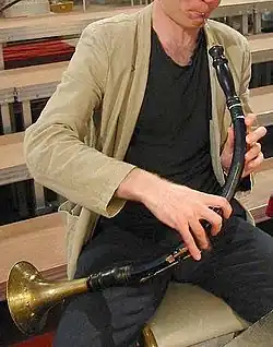 The oboe da caccia has a leather-covered wooden body terminating in a large wooden bell, or in the case of Eichentopf's instruments, a flaring brass bell as pictured above. There are typically two brass keys, E-flat and C. The E-flat key is normally doubled for the left hand. There are usually two twin fingerholes, G/A-flat and F/F#, similar to the soprano baroque oboe. The construction differs from that of practically all other woodwinds. The bore and outward profiles are first created on the lathe, then a series of saw kerfs are made through the bore from the side, which is to become the inner curve. Then the instrument is bent over steam and a slat glued onto the inside curve to fix it. Any remaining lacunae in the kerfs are filled and the curved section is covered with leather. The da caccia is played with a double reed; the sound is very mellow and supple.