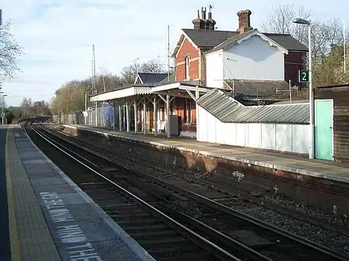 Ockley railway station serves the villages of Ockley and Capel in Surrey, England and is 1.4 miles (2.3 km) east of Ockley village and 0.5 miles (0.8 km) west of the village of Capel. The station is 29 miles 20 chains (47.1 km) from London Waterloo station (although London-bound trains run to Victoria).[1] Ockley is managed by Southern which also provide the services.
