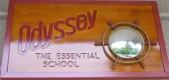 ![]() A plaque in front of the school. The logo on the right shows a ship's steering wheel. | |