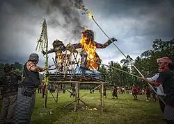 At dusk after the Mecaru ritual, Balinese Hindus perform Pangrupukan. This activity is marked by lighting torches or burning dried coconut leaves (in Balinese: mebuu-buu) and making loud noises using instruments like kentungan, tawa-tawa, cengceng, or other musical alternatives while walking around their homes or villages. The purpose is to drive away evil forces or negative influences from the surroundings.[48] Pangrupukan is often accompanied by the ogoh-ogoh parade, representing the negative traits within humans, embodied as butakala (malevolent beings). The ogoh-ogoh are then burned as a symbolic act of destroying these negative traits.[49] This procession is comparable to exorcism from a Western cultural perspective.[48]